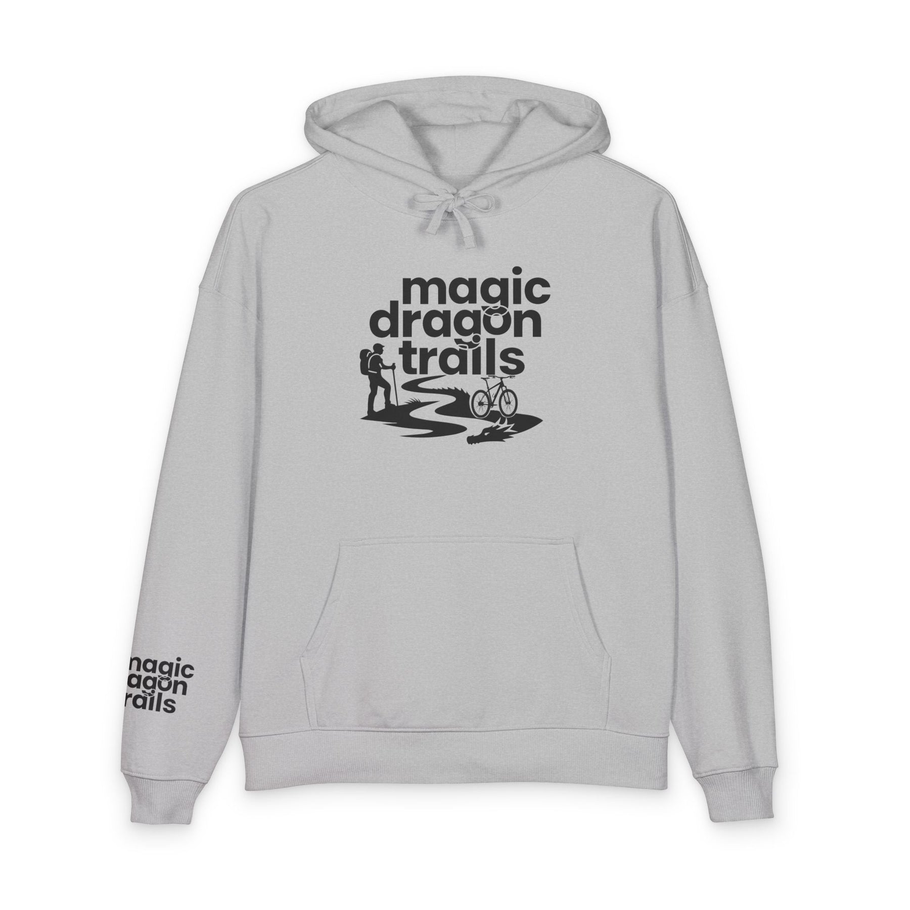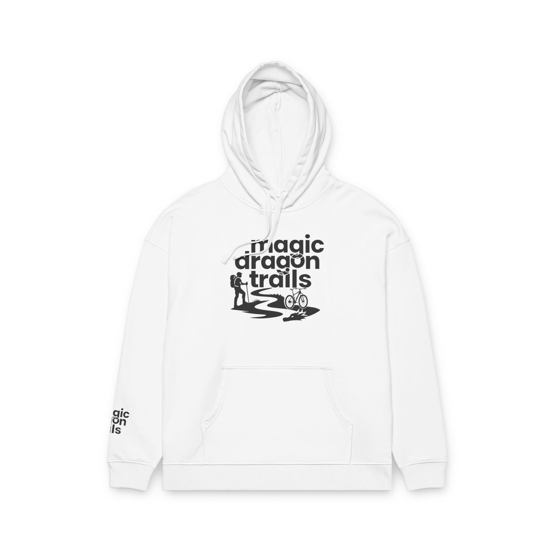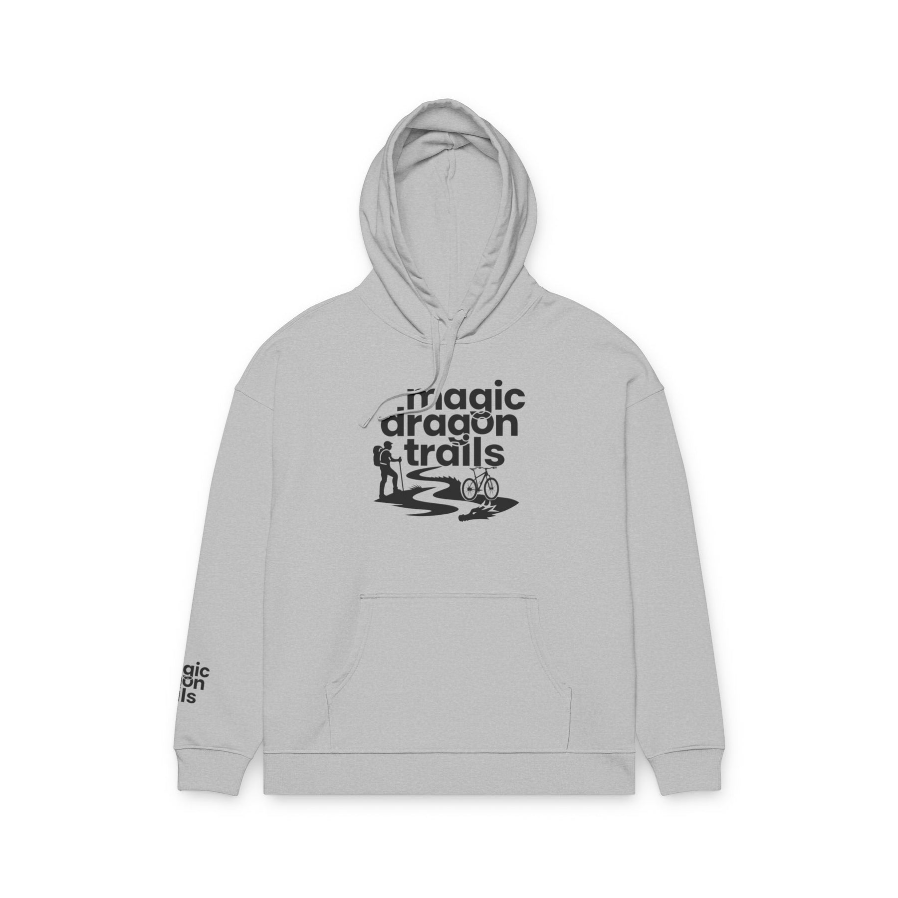 This relaxed organic hoodie blends soft, substantial fleece with a minimalist outdoor graphic to become a go-to layer for slow mornings, trailside breaks, and campfire conversations. The design — a winding trail, tiny camper silhouette, and the words “magic dragon trails” — feels quietly adventurous, like a foggy dawn on a favorite path. Wear it when you need warmth without stiffness, when you want a cozy canvas that quietly speaks to your love of low-key exploration and weekend escapes. The roomy kangaroo pocket holds snacks and maps. The slightly dropped, relaxed cut keeps movement easy during hikes or while layering at home. Built details like reinforced necktape and twin-needle topstitching mean this will age like a well-traveled favorite rather than a disposable piece.