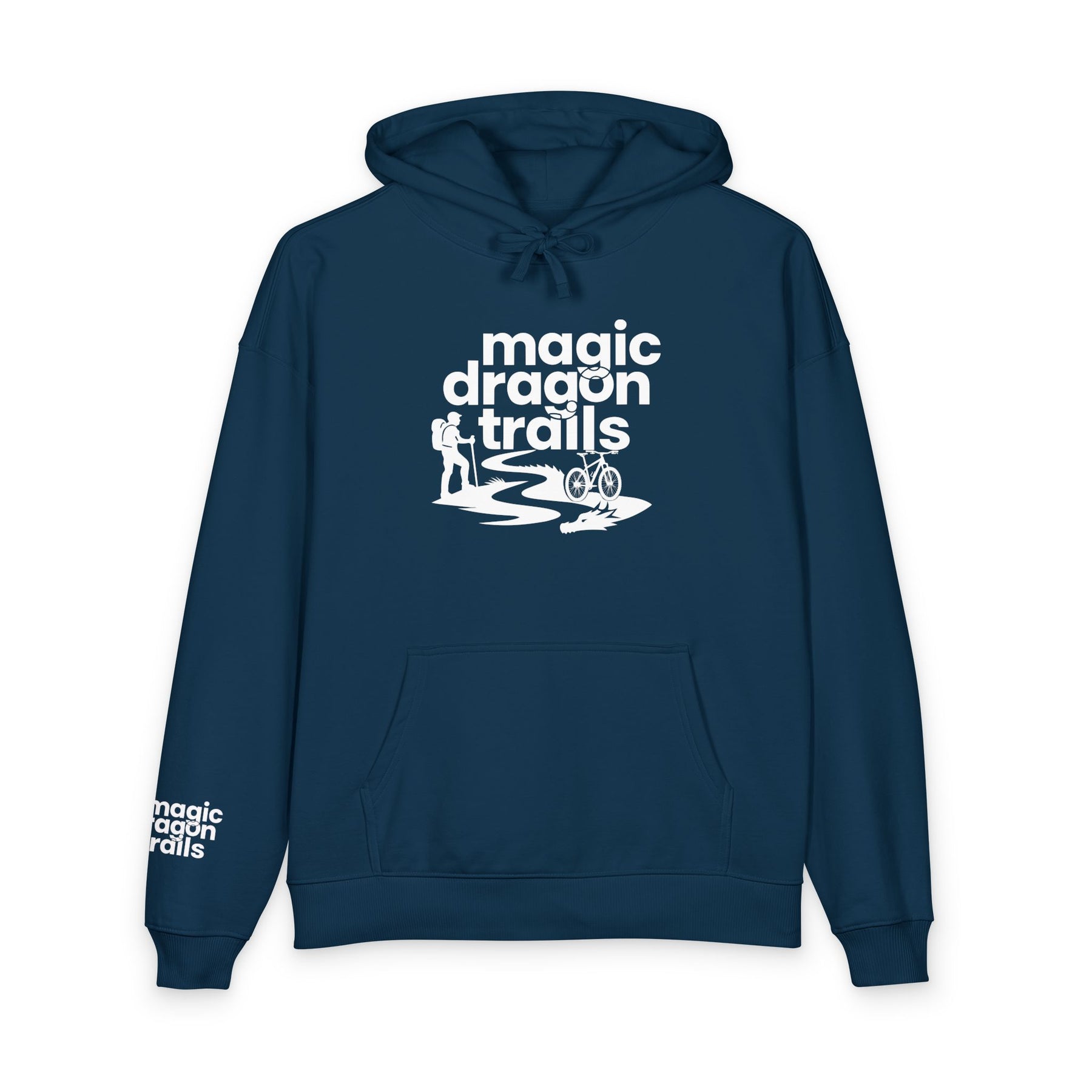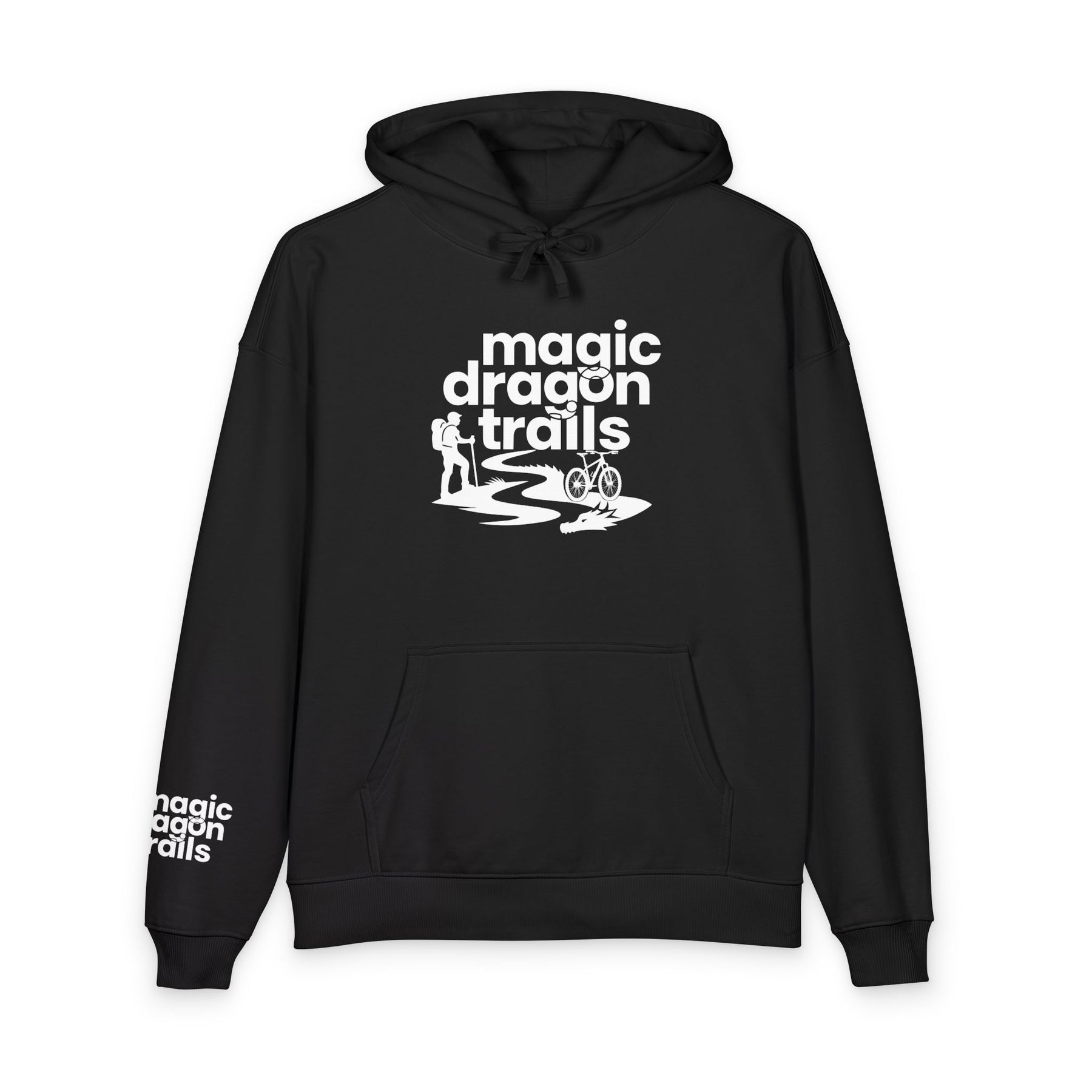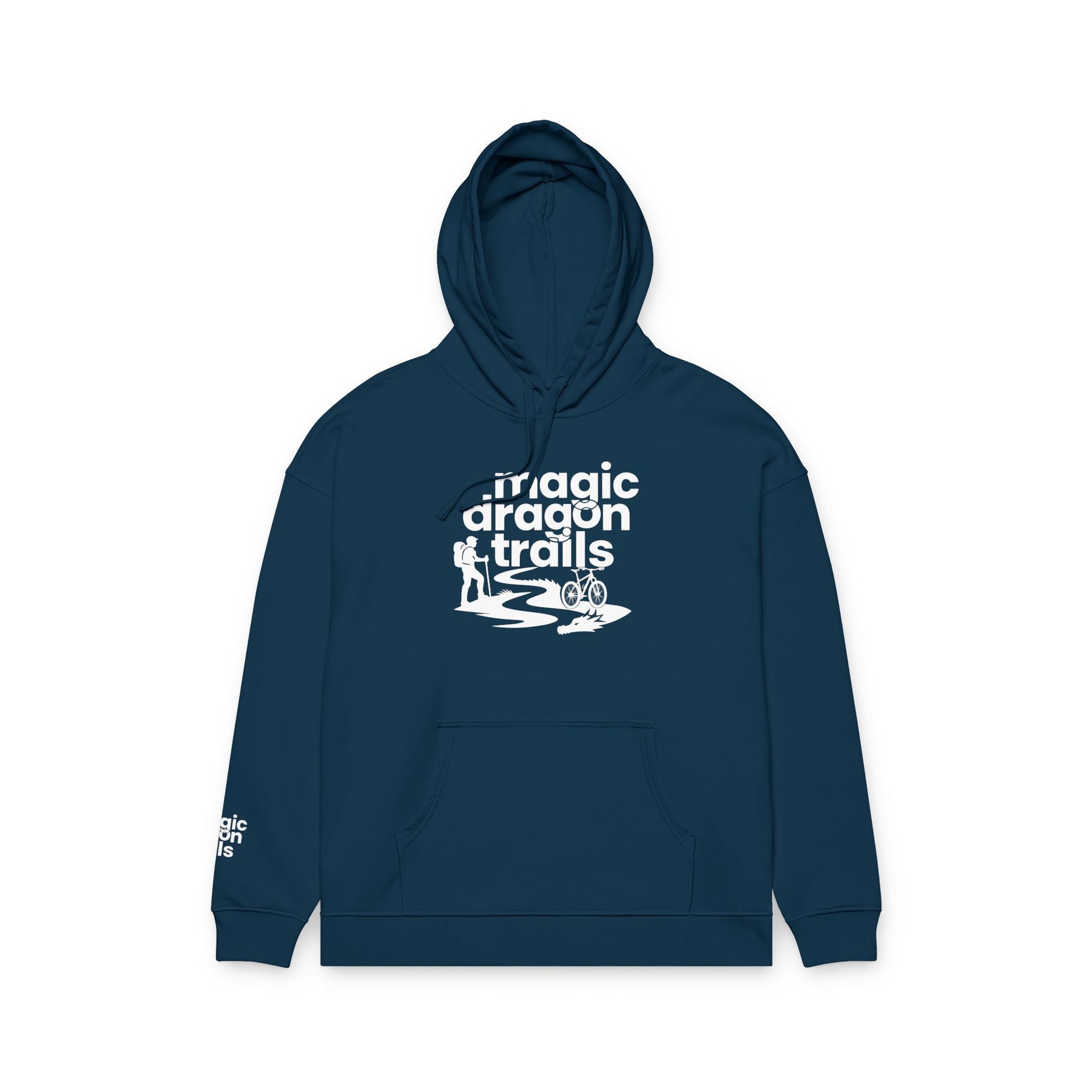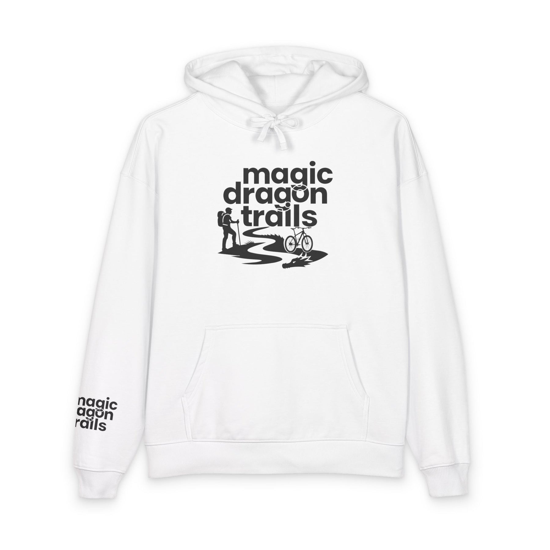 This relaxed organic hoodie blends soft, substantial fleece with a minimalist outdoor graphic to become a go-to layer for slow mornings, trailside breaks, and campfire conversations. The design — a winding trail, tiny camper silhouette, and the words “magic dragon trails” — feels quietly adventurous, like a foggy dawn on a favorite path. Wear it when you need warmth without stiffness, when you want a cozy canvas that quietly speaks to your love of low-key exploration and weekend escapes. The roomy kangaroo pocket holds snacks and maps. The slightly dropped, relaxed cut keeps movement easy during hikes or while layering at home. Built details like reinforced necktape and twin-needle topstitching mean this will age like a well-traveled favorite rather than a disposable piece.